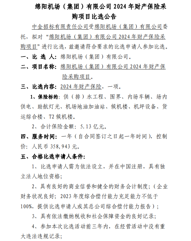 綿陽(yáng)機(jī)場(chǎng)(集團(tuán))有限公司2024年財(cái)產(chǎn)保險(xiǎn)采購(gòu)項(xiàng)目比選公告