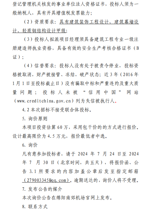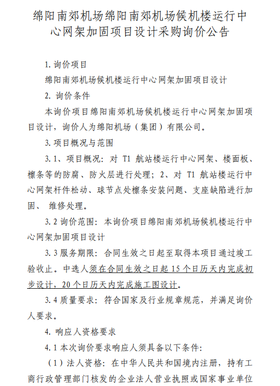 綿陽南郊機場綿陽南郊機場候機樓運行中心網(wǎng)架加固項目設計采購詢價公告