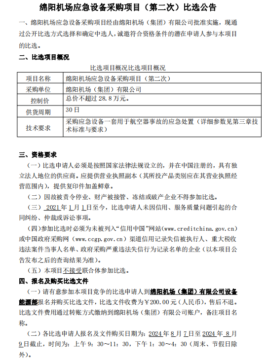 綿陽機(jī)場應(yīng)急設(shè)備采購項目(第二次)比選公告